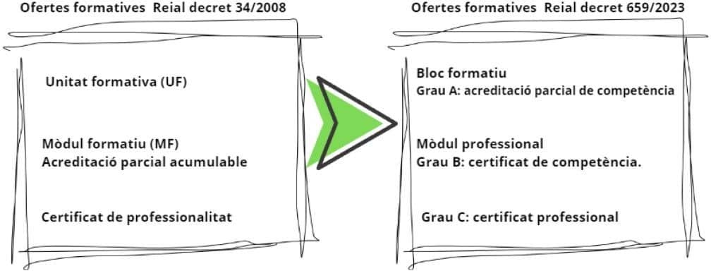 Tanmateix, qualsevol referència feta a «mòdul formatiu», «capacitats» o «unitat formativa» s’haurà d’entendre feta a «mòdul professional», «resultats d’aprenentatge» i «bloc formatiu», respectivament; així com l’equivalència entre la relació de l’oferta formativa:”